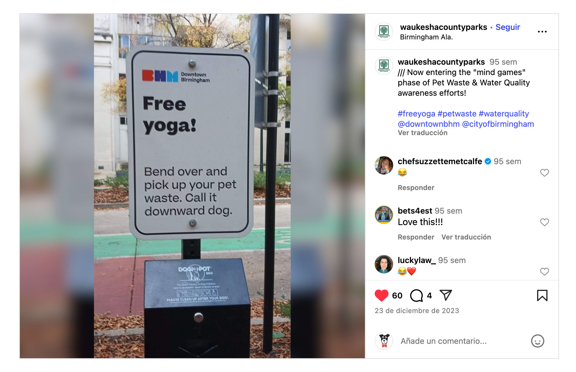 Muchas personas han compartido estas señales que están en Downtown Birmingham, EEUU, desde hace ya un par de años. Porque hacen sonreír y, evidentemente, captan la atención. Si recoges las cacas, es como una sesión de yoga gratis :-)