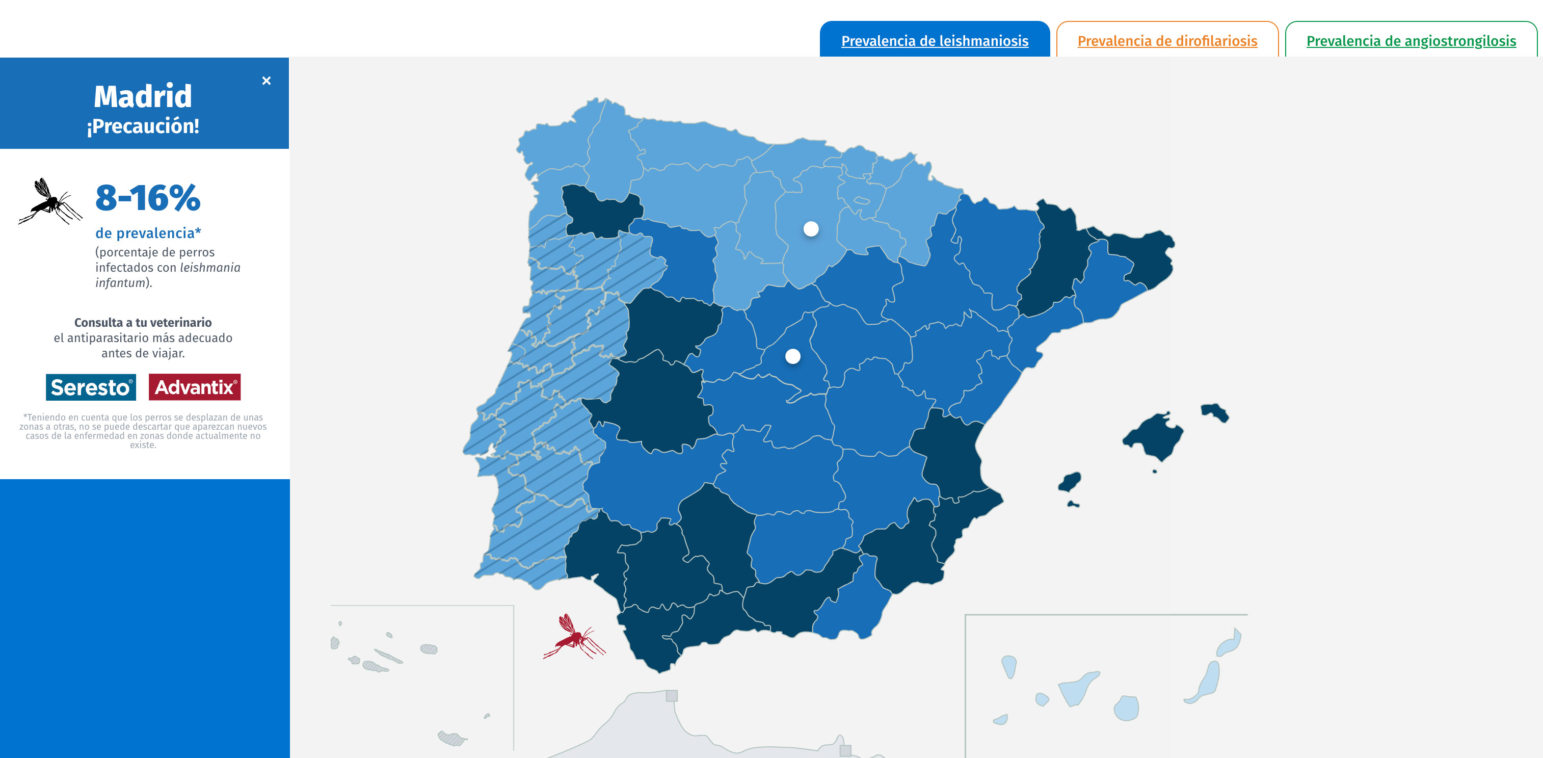 En este mapa, se puede consultar la prevalencia (porcentaje de perros infectados) de enfermedades parasitarias en las diferentes zonas de España y Portugal: https://www.mapaelanco.com/