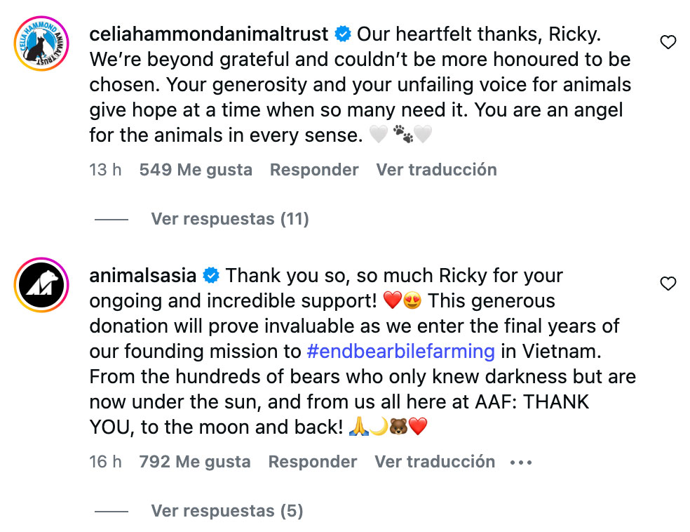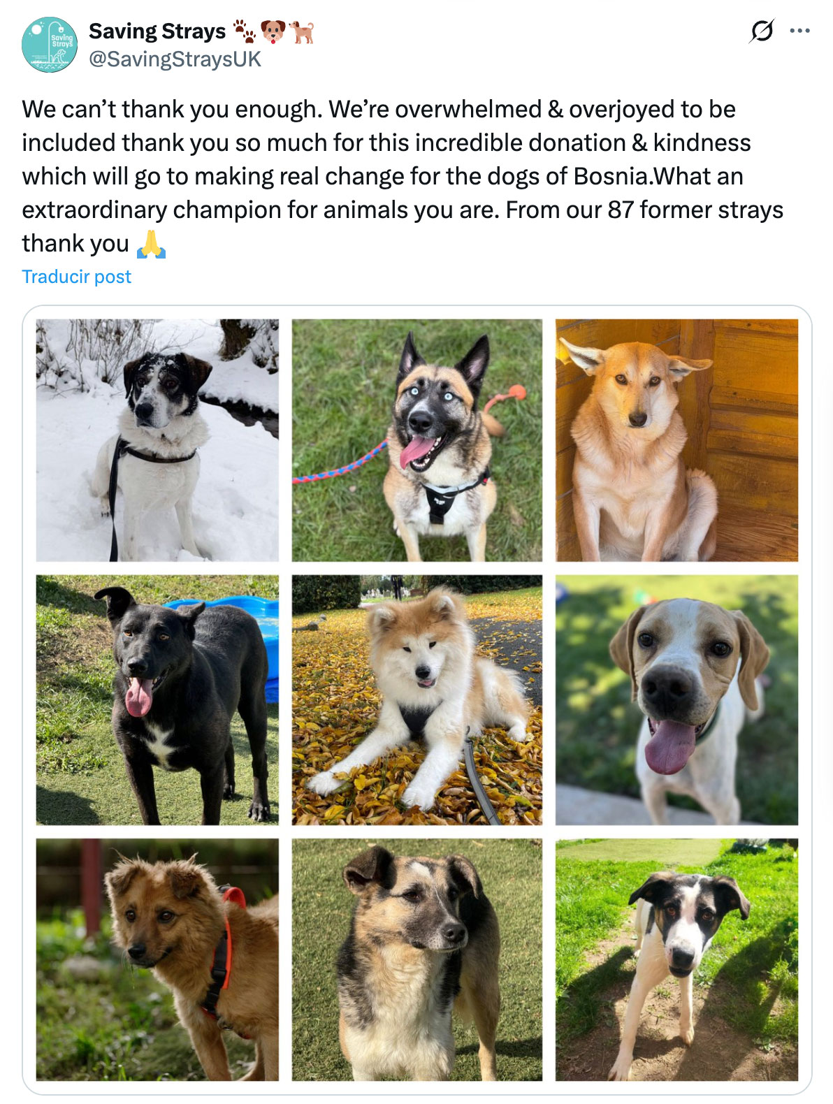 Desde PDSA a Dogs on the Street pasando por Animals Asia le han agradecido públicamente este fabuloso gesto que, ojalá, sirva de inspiración para otras celebridades en todo el mundo...