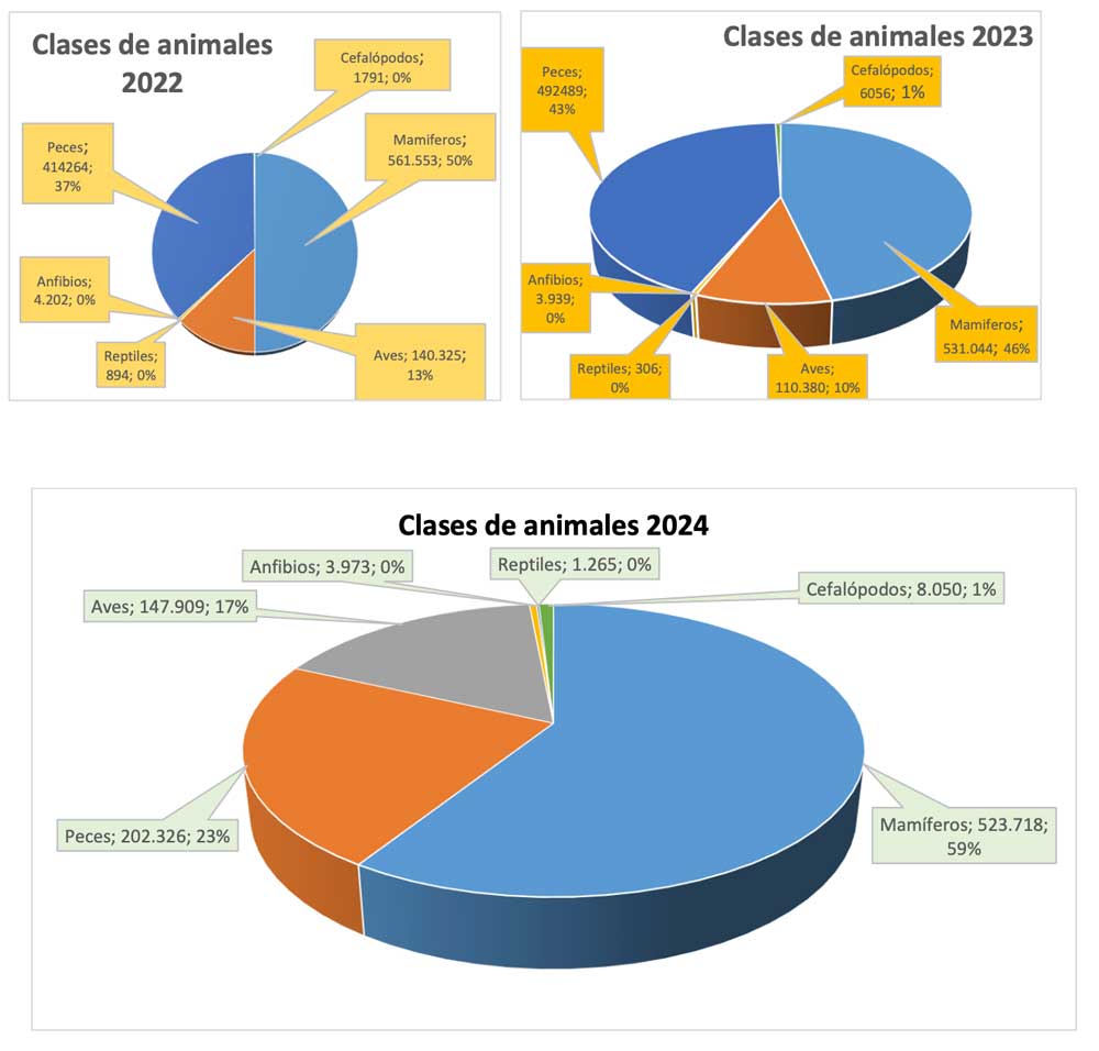 En la web de las estadísticas de la Comisión Europea se puede analizar al detalle el uso de animales, por país y uso. Pero esos datos son de 2023, entrando en la web del Ministerio de Agricultura, se puede encontrar información actualizada a 2024 para España. El total de usos ha vuelto a aumentar con respecto a 2023, de 1.081.114 a 1.123.000 usos.