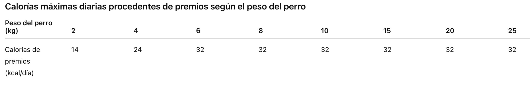 La siguiente tabla indica el máximo de calorías procedentes de premios en función del peso corporal actual pero lo ideal es consultarlo con tu veterinario, recomienda WSAVA.