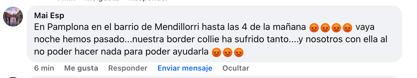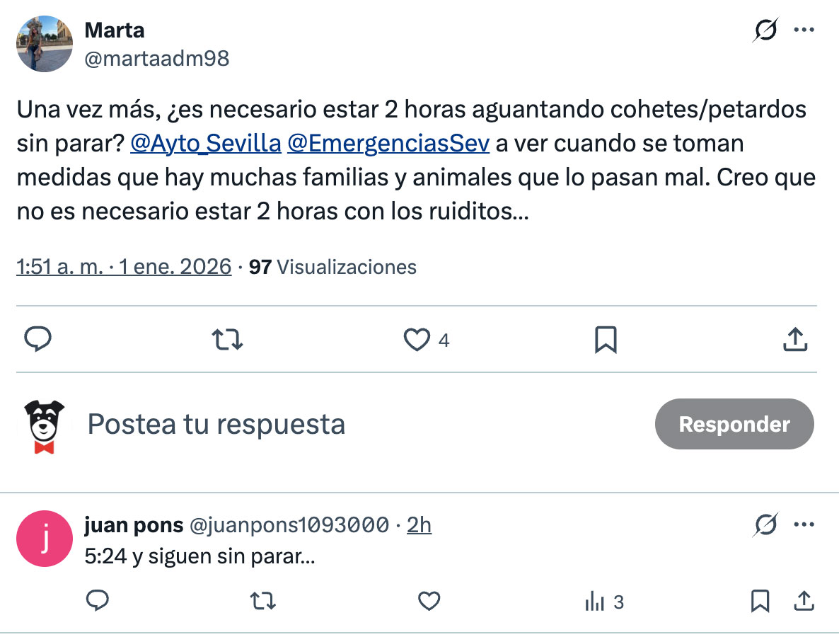 "Aquí en Córdoba, donde llevan prohibidos 8 años, cada año se superan. Este año, en mi barrio, parque Figueroa, tracas valencianas, petardazos tirados a portales y ventanas, fuegos artificiales... De locos, más de 15 horas, empezaron por la mañana y han acabado al amanecer. Y esto no ha acabado, hoy cuando se levanten tirarán los que sobraron, seguro. A mi perro, a pesar de los tranquilizantes tuve que llevarlo a urgencias porque casi se me infarta.Esto no tiene arreglo, da igual que se prohiban mientras la policía nunca acuda y mientras se sigan vendiendo."