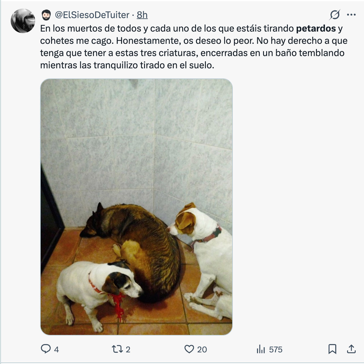 La gracieta de este año en redes, para generar más mal rollo es una frasecita que repiten una y otra vez: "A tu perro le molestan mis petardos y a mí me molestan sus ladridos. Empate!!!"