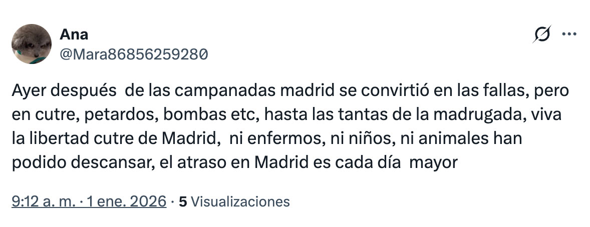 "Vivo en Madrid en Rivas Vaciamadrid y desde el año pasado, están con petardos hasta las 6 de la mañana. Se juntan jóvenes en el Auditorio y es un no parar. No hay ni una patrulla de policía. Había dos patrullas a eso de las 20h donde el auditorio, pensamos que este año se quedarían para disuadir la quedada, pero no, ni rastro. No es una zona apartada precisamente, está rodeado de casas y de un secarral que se podría quemar y liarla parda. En fin…."