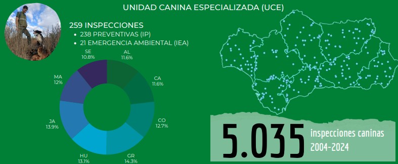 La Unidad Canina Especializada de la Junta de Andalucía está compuesta por dos equipos formados por 4 perros y un guía canino, cada uno. Los canes, pastor belga malinois, border collie y también de otras razas, están entrenados para detectar todo tipo de sustancias en el medio natural y adiestrados para la identificación de venenos en vehículos, naves agrícolas y viviendas.