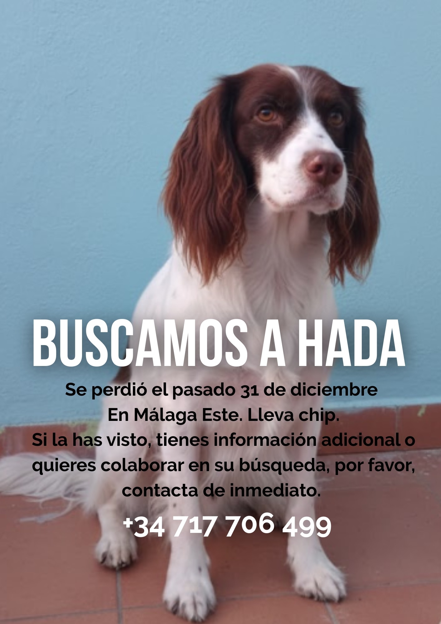 "Nuestra perrita HADA desapareció el pasado 31 de diciembre en la zona de la playa El Dedo (Málaga Este). Se asustó por los petardos de Nochevieja y desde entonces no sabemos nada de ella. Puede estar escondida o desorientada por los alrededores: El Palo, El Candado, Jarazmín o incluso haber corrido hacia La Cala del Moral.