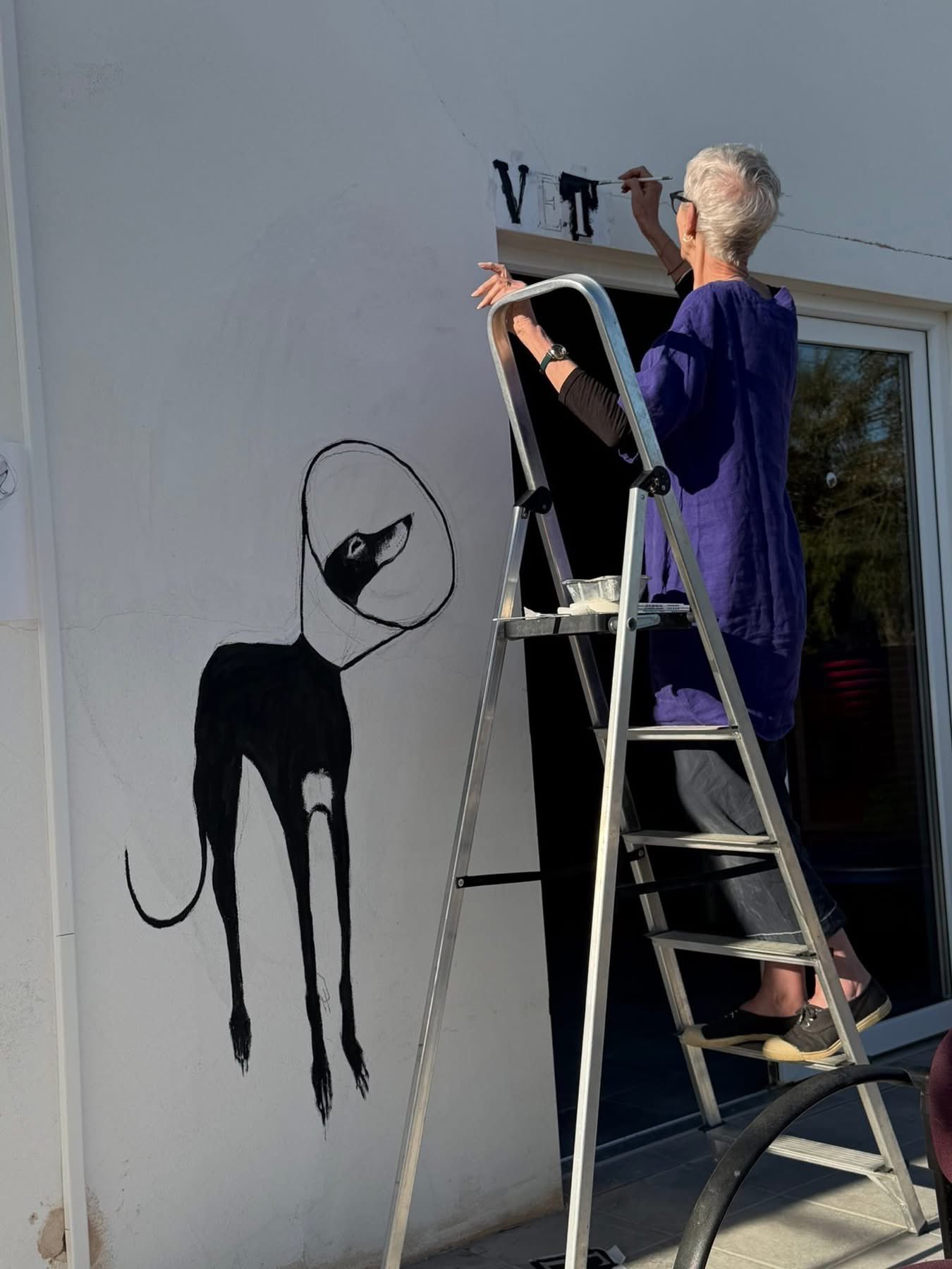 "Acabamos de pasar unos días increíbles con la inigualable Sally Muir de A Dog A Day. Vino a GDS para alegrar tanto a los perros en los cheniles como a las personas, no solo siendo ella misma, sino también con el pincel... ya saben... esa cosa de madera que es como una extensión de su mano. Sally también compartió y trabajó con Rafa, quien también ha traído muchísima alegría con sus obras de arte por todo el centro GDS. Ambos tienen estilos muy diferentes, pero ambos nos alegran los días. Rafa siempre saca una sonrisa al equipo con algún dibujo sorpresa.