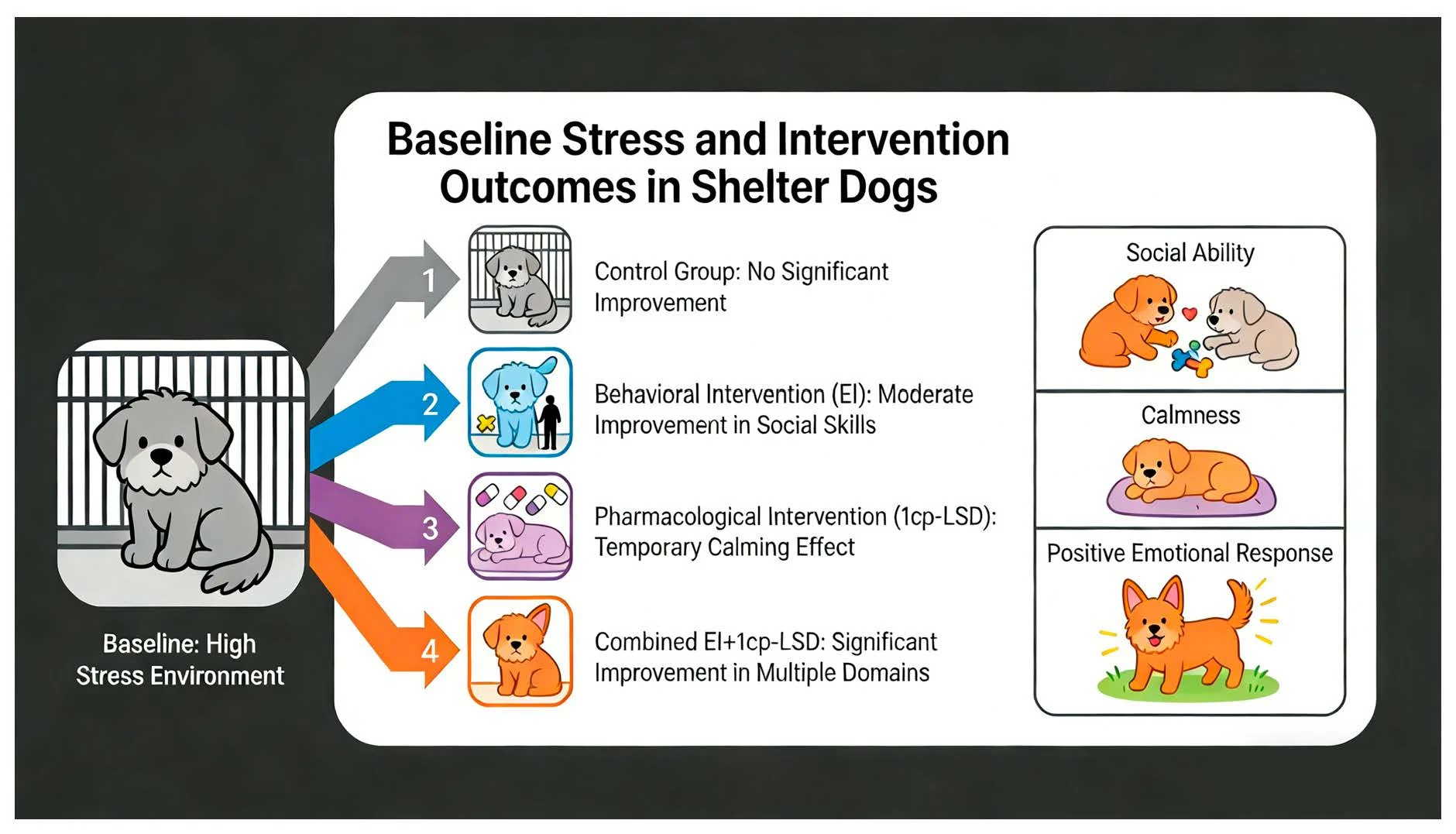 Los resultados mostraron que la administración combinada de 10 µg de 1cp-LSD y una intervención etológica durante un periodo de tres semanas mejoró de forma significativa cuestiones esenciales en el bienestar de los perros: mostraron mayores mejoras en la calma, la sociabilidad y las respuestas emocionales positivas en comparación con las intervenciones individuales o los controles.